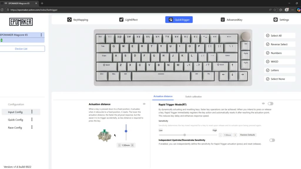 Epomaker utilizes a web-based driver for configuration, completely removing the need for a dedicated, bloatware-heavy software download. The interface allows for precise adjustments to actuation points, Rapid Trigger sensitivity, and advanced bindings like SOCD and Mod Tap. Testing SOCD in Valorant provided seamless counter-strafing, while Rapid Trigger made executing superglides in Apex Legends highly consistent.