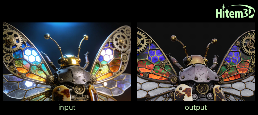 Beyond structure, Hitem3D 2.0 eliminates the “baked-in” lighting artifacts that typically muddy texture data. Using the mechanical butterfly as a benchmark, the system intelligently neutralizes blue spotlight interference in source images.