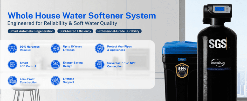 iSpring proudly introduces the all-new WCSTB45KG Whole House Water Softener System, designed to combat hard water that causes scale, spots, stiff laundry, and appliance wear. It delivers soft, clean water to every faucet in your home.