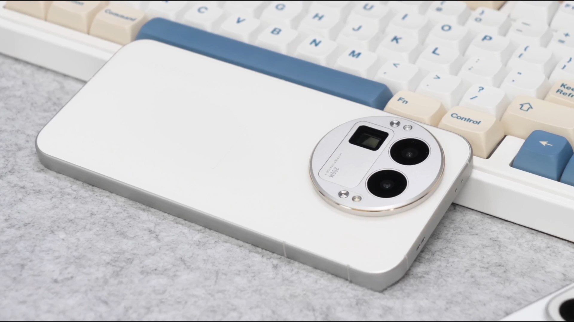 Let’s start with the very eye-catching exterior. This color is called White. It uses white AG glass. What I’m showing you now is how it looks right out of the box. It has a circular camera deco. You can clearly see two screws. The outer ring of the camera module is replaceable. I have two replacement parts here, a rectangular one and a transparent one. Which one do you guys think looks better? If you don’t do anything, it looks like this. The official name is the Mecha Robot. This little robot design is actually quite cute.